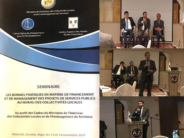 Les 13 et 14 novembre 2019, la Caisse Nationale pour l’Equipement et le Développement (C.N.E.D) a animé, à la demande du Ministère de l’Intérieur, des Collectivités locales et de l’Aménagement du Territoire (M.I.C.L.A.T), les travaux d’un séminaire portant sur le thème : « Les bonnes pratiques en matière de financement et de management des projets de services publics au niveau des collectivités locales ». En partenariat avec l’Institut Algérien des Hautes Etudes Financières (I.A.H.E.F) , la C.N.E.D a ainsi apporté son expertise et son assistance technique aux collectivités locales dans le domaine du management et financement des projets de service public.